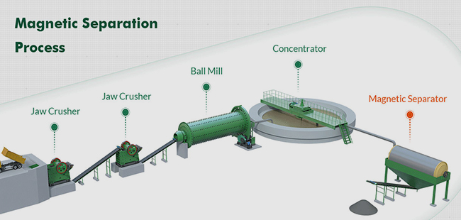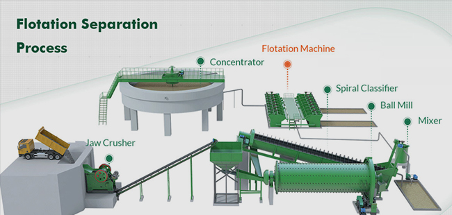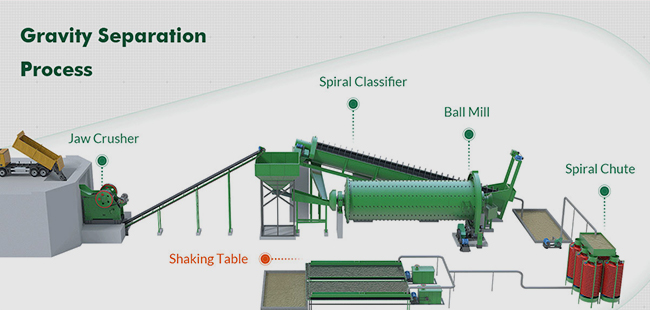 2) Grinding and classification process: ball mill/rod mill (150-200 mesh), spiral classifier/high frequency screen/water flow cyclone